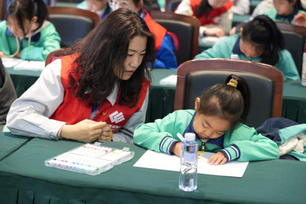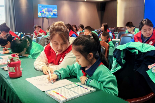在人头攒动的报告厅,笔者注意到一位“红马甲”。在共同作画的环节中,她与身边的小朋友一边说说笑笑,一边不断地拿出手机拍照记录小朋友的绘画过程,场面十分温馨。在与她的交谈中笔者得知,她叫许晶,是亿利电厂“小鸿雁”志愿服务队的“元老”,自2009年入职就加入了“小鸿雁”。“我很喜欢这些孩子们,我们很容易成为朋友。”她笑着说。