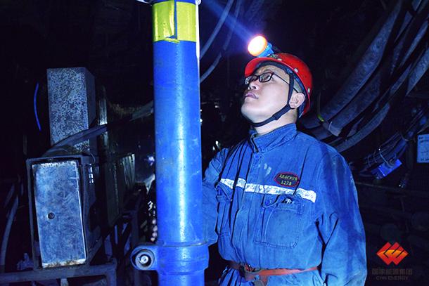 图为职工正在生产现场查看单体支护是否存在安全隐患。