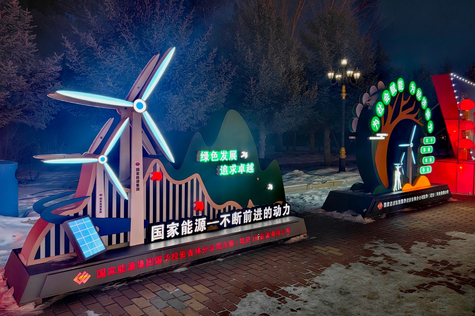夜幕渐临,随着乾安县公园内响起参观群众的一阵阵欢声笑语,一座座花灯纷纷于黑夜中“苏醒”,而在遍布鲜红喜庆氛围的一隅中,独属于国家能源集团新能源色彩那道光渐渐显现: