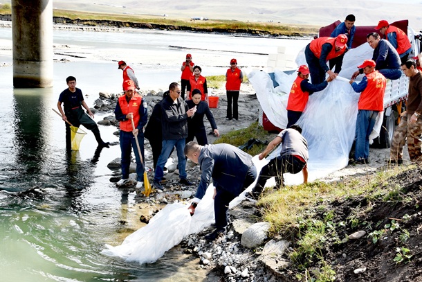 鱼苗入水的瞬间,是整场活动中最动人的时刻。志愿者们分成两组,一组将一盆盆活泼的鱼苗缓缓倾入伊犁喀什河的激流中;另一组则利用自制的“传送带”,让鱼苗如流动的汞线般滑入水中。无数细小的银色生命甫一接触冰冷的河水,便瞬间迸发出勃勃生机,奋力摆尾,带着新生的勇气汇入碧波深处。岸上,快门的“咔嚓”声与志愿者们的欢呼交织在一起,成为高原上最动听的生态乐章。