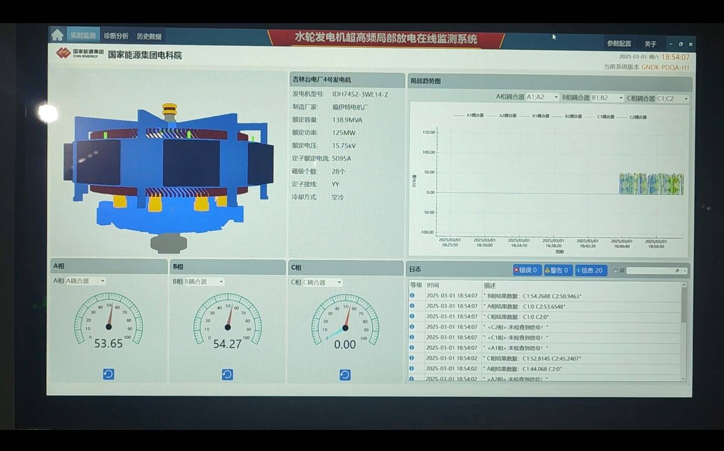 该项目采用电科院自研千兆赫兹技术,打破西方国家在超高频局放领域近四十年的技术封锁。相比于国外产品存在的“误报、漏报”等问题,电科院自主研发的监测系统精度更高,通过优化核心算法减少误报、杜绝漏报。本次示范工程利用吉林台4号机组检修,在极寒环境中,电科院项目团队以“精密施工、智慧调试”的双轨推进机制,将原本需要两周的安装调试周期压缩至96小时。面对狭小的机组检修窗口期,技术团队创新采用“模块化预装+现场智能适配”工艺,日间开展传感器阵列的毫米级定位安装,夜间实施信号采集系统与智能分析平台的迭代优化,成功攻克电磁干扰屏蔽、宽频信号捕捉等六大技术难关,使系统达到误报率小于0.5‰的行业领先水平。经过四昼夜连续攻坚,成功完成“吉林台公司发电机自主可控超高频定子局放监测系统研发及工程示范”项目首台套设备的工程化安装与系统联调。2月25日该装置顺利通过耐压试验关键节点,2月27日成功实现带负荷运行,3月1日电厂完成并网操作,系统保持稳定运行72小时,标志着我国在发电机状态智能感知领域实现关键技术突破。